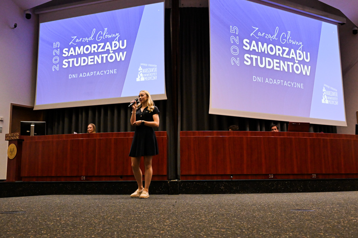 Podczas dni adaptacyjnych nie zabrakło również prezentacji Zarządu Głównego Samorządu Studentów WUM. O jego działalności mówiła przewodnicząca - Anna Kupczak.