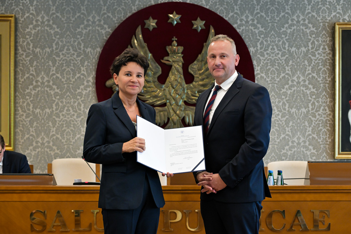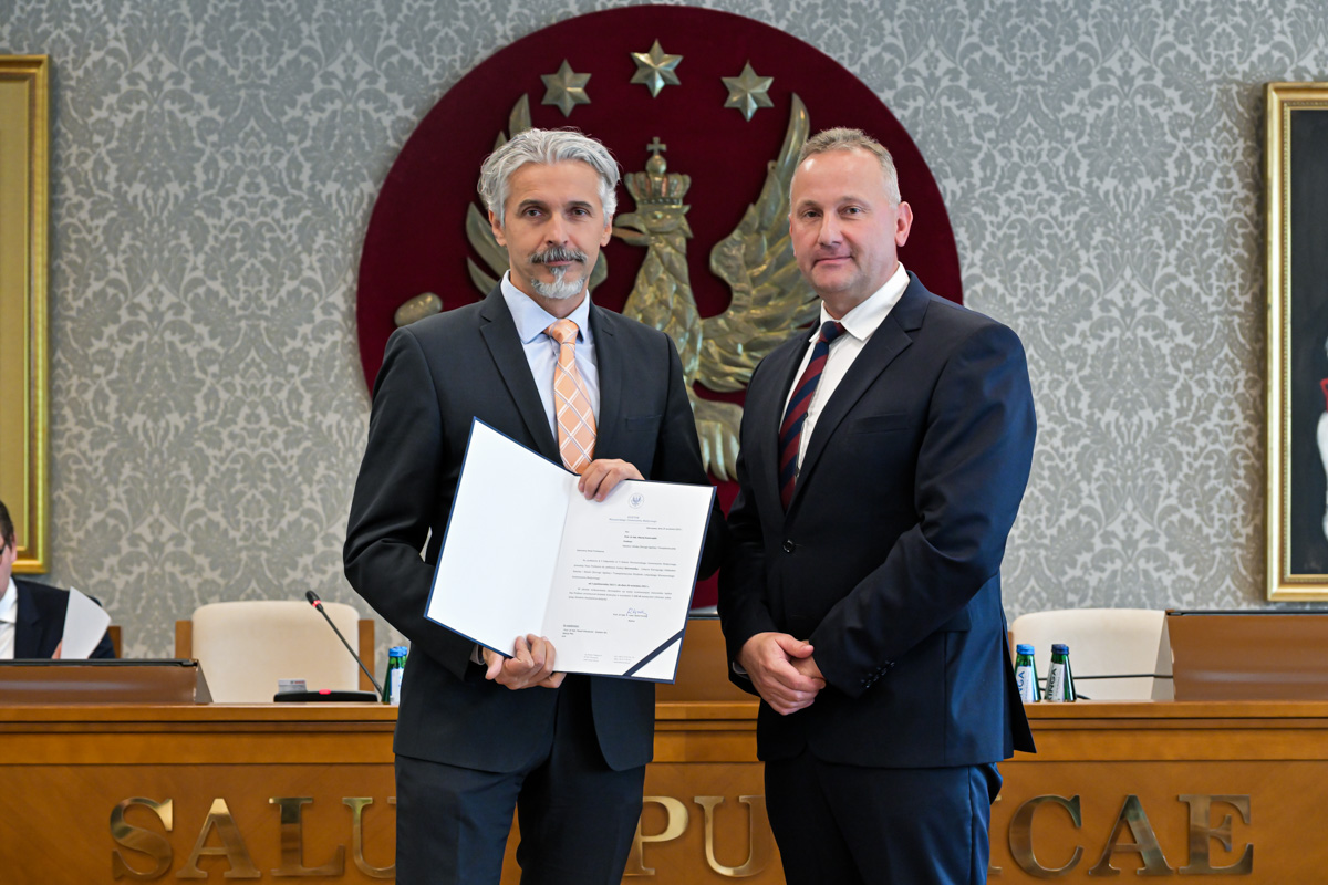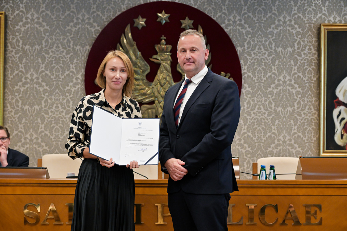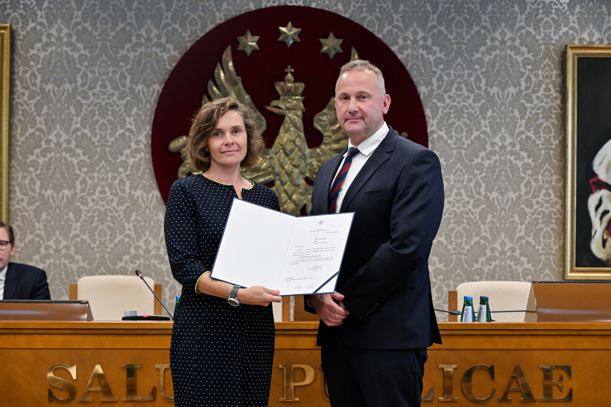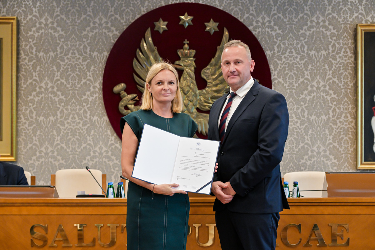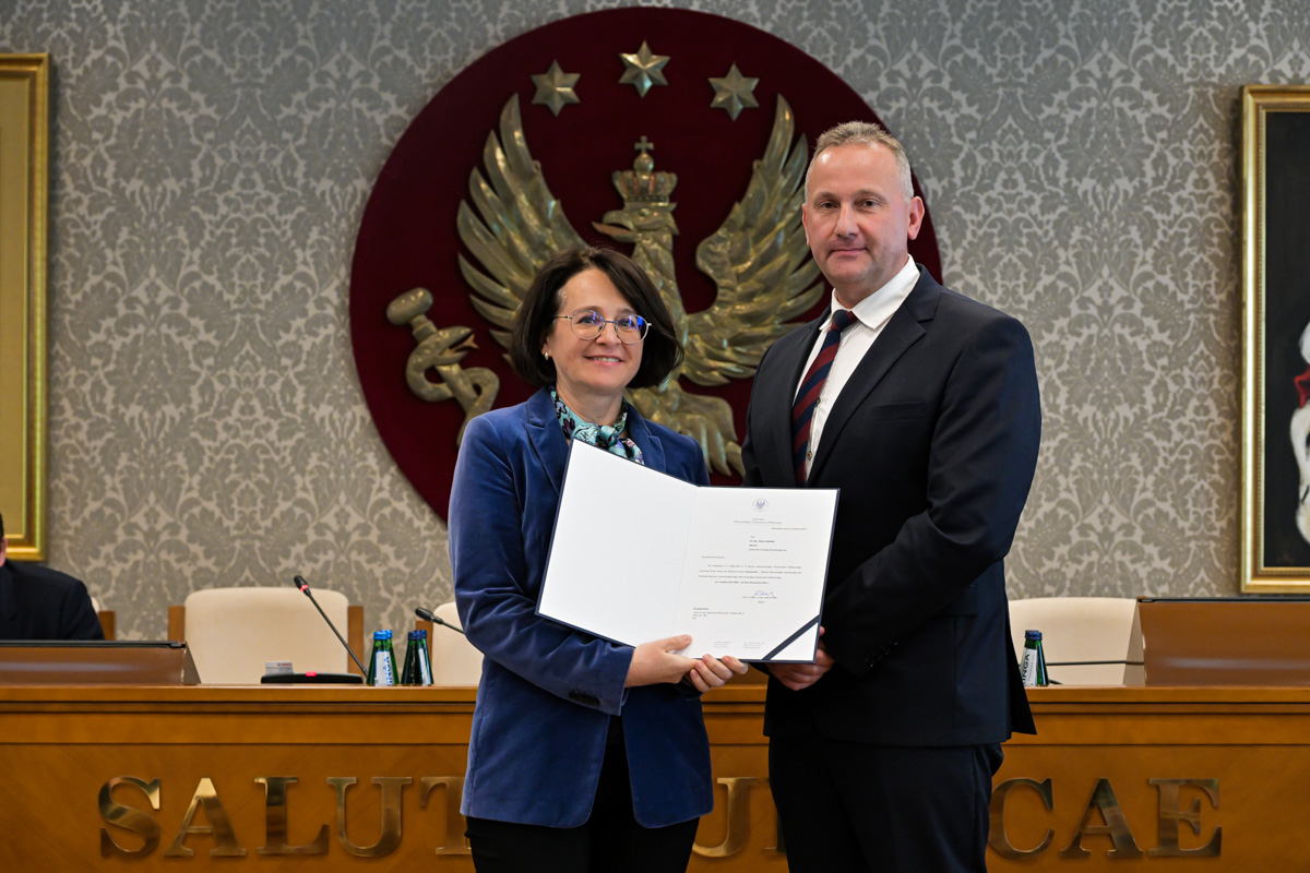 Galeria około 35 zdjęć z wręczenia dyplomów gratulacyjnych oraz powołań dla pracowników i studentów WUM. Na zdjęciach znajdują się pracownicy i studenci w towarzystwie prorektora ds. nauki i transferu technologii prof. Marcina Sobczaka. Osoby na zdjęciach otrzymują dyplomy w granatowych teczkach. Teczki są otwarte, widać w nich dyplomy. Większość osób uśmiecha się do zdjęcia. Wszystkie osoby na zdjęciach są formalnie ubrane: mężczyźni w marynarki lub garnitury, kobiety w sukienki lub marynarki i eleganckie koszule. Zdjęcia zostały wykonane w dużej sali - Sali Senatu WUM. Ściany sali pokrywa tapeta w odcieniu ciemnego złota z motywem roślinnym. Na ścianie wisi godło WUM: orzeł i gwiazdy na czerwonym tle, a także obrazy przedstawiające byłych rektorów WUM, ubranych w czerwone płaszcze z białymi futrzanymi kołnierzach i berłami rektorskimi w rękach. Obrazy są w złotych ramach.