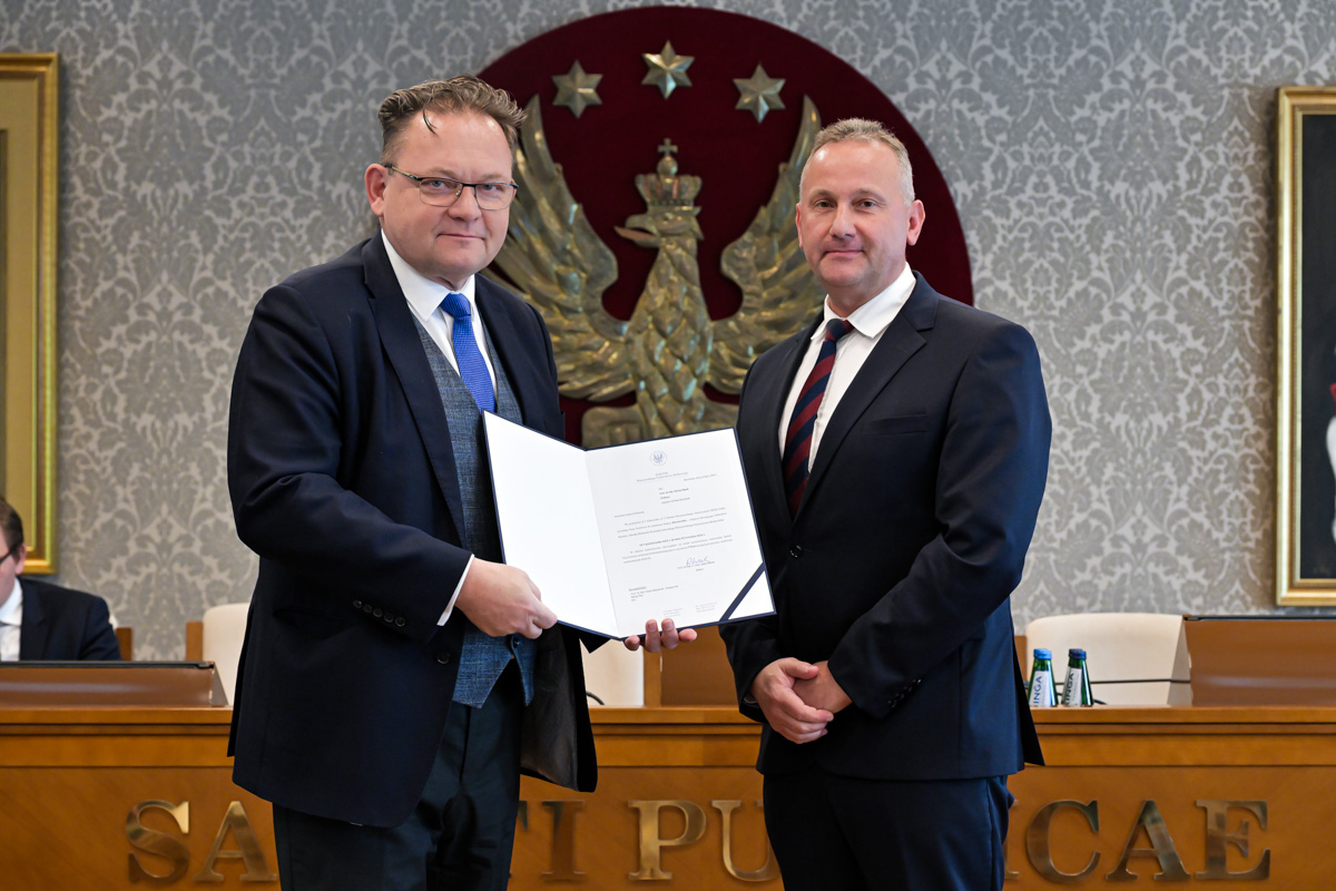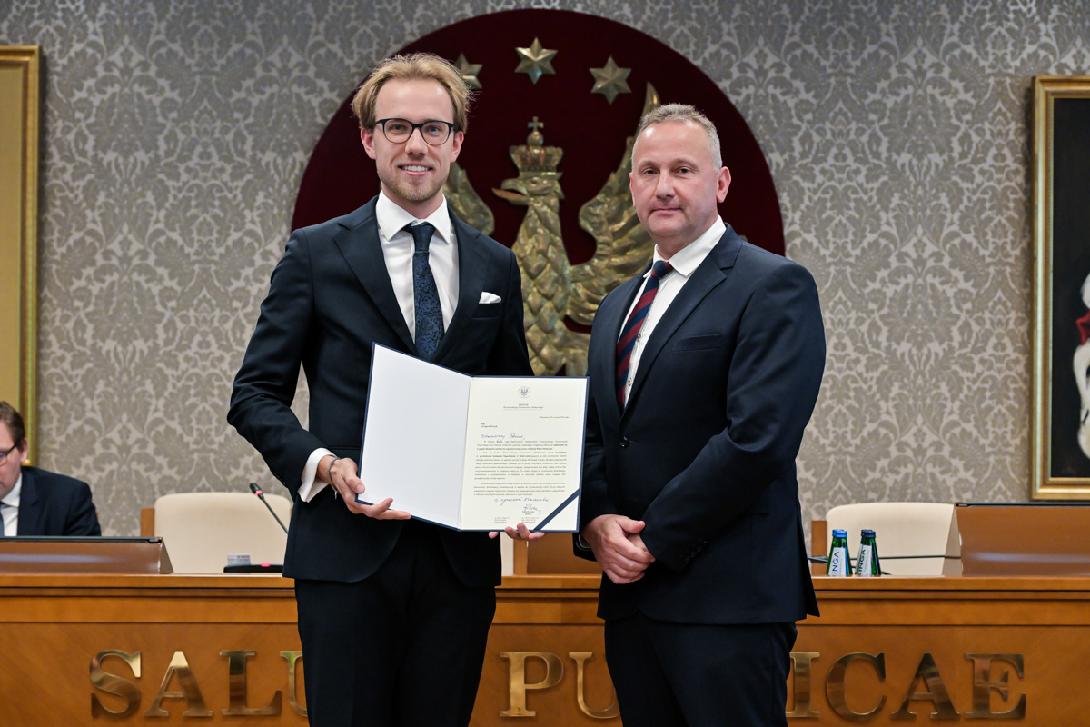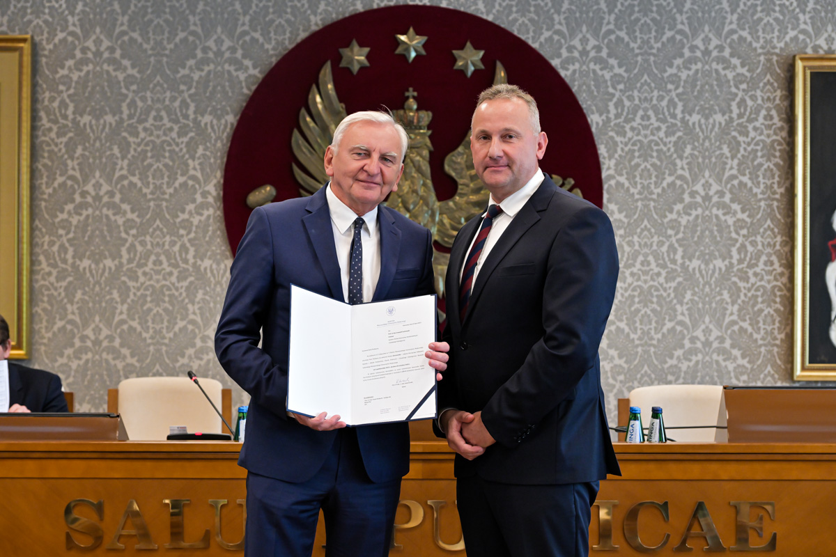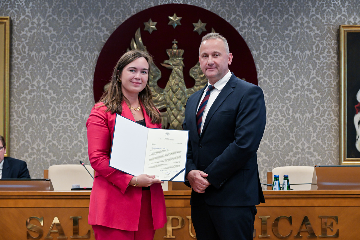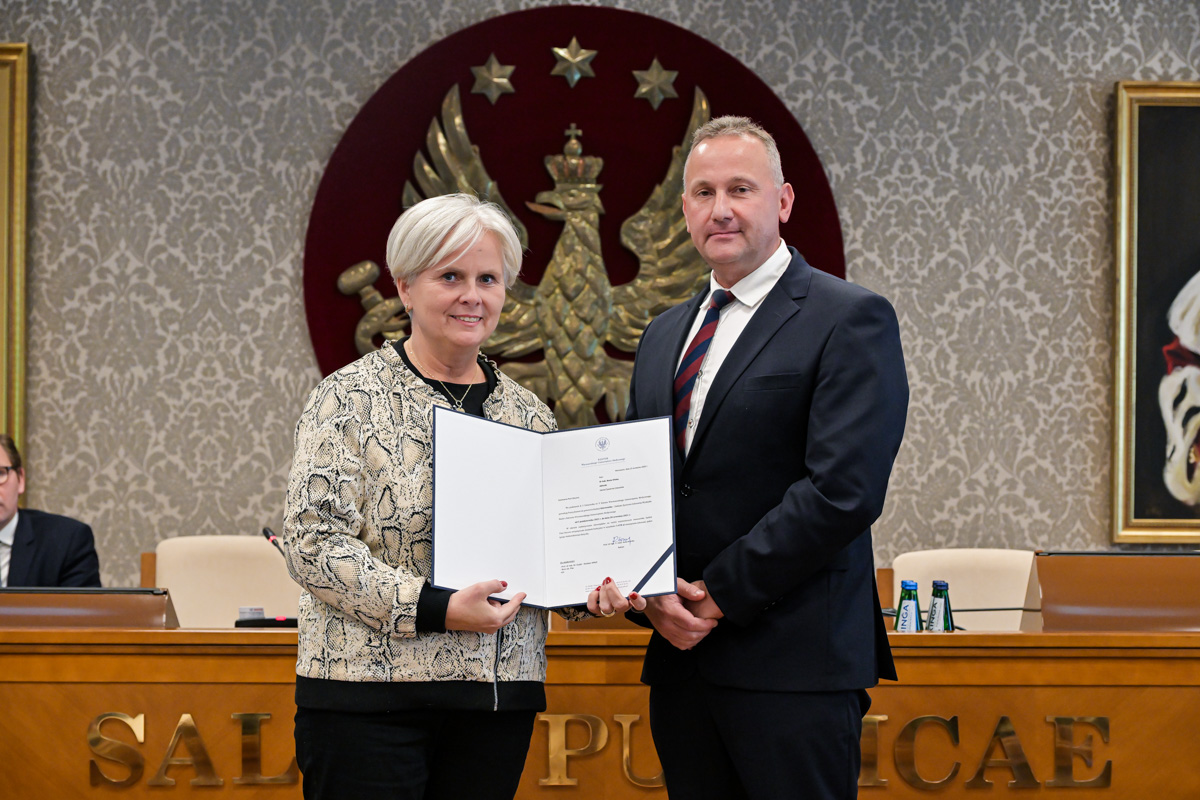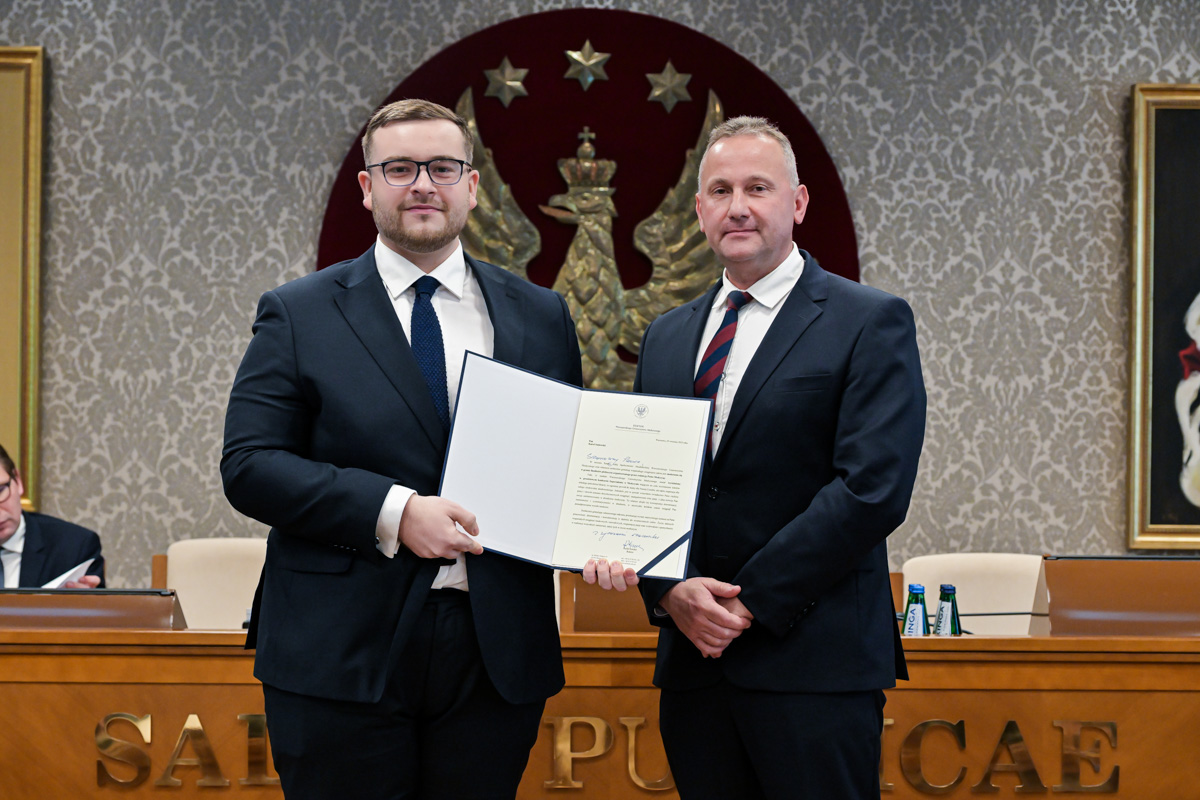Galeria około 35 zdjęć z wręczenia dyplomów gratulacyjnych oraz powołań dla pracowników i studentów WUM. Na zdjęciach znajdują się pracownicy i studenci w towarzystwie prorektora ds. nauki i transferu technologii prof. Marcina Sobczaka. Osoby na zdjęciach otrzymują dyplomy w granatowych teczkach. Teczki są otwarte, widać w nich dyplomy. Większość osób uśmiecha się do zdjęcia. Wszystkie osoby na zdjęciach są formalnie ubrane: mężczyźni w marynarki lub garnitury, kobiety w sukienki lub marynarki i eleganckie koszule. Zdjęcia zostały wykonane w dużej sali - Sali Senatu WUM. Ściany sali pokrywa tapeta w odcieniu ciemnego złota z motywem roślinnym. Na ścianie wisi godło WUM: orzeł i gwiazdy na czerwonym tle, a także obrazy przedstawiające byłych rektorów WUM, ubranych w czerwone płaszcze z białymi futrzanymi kołnierzach i berłami rektorskimi w rękach. Obrazy są w złotych ramach.