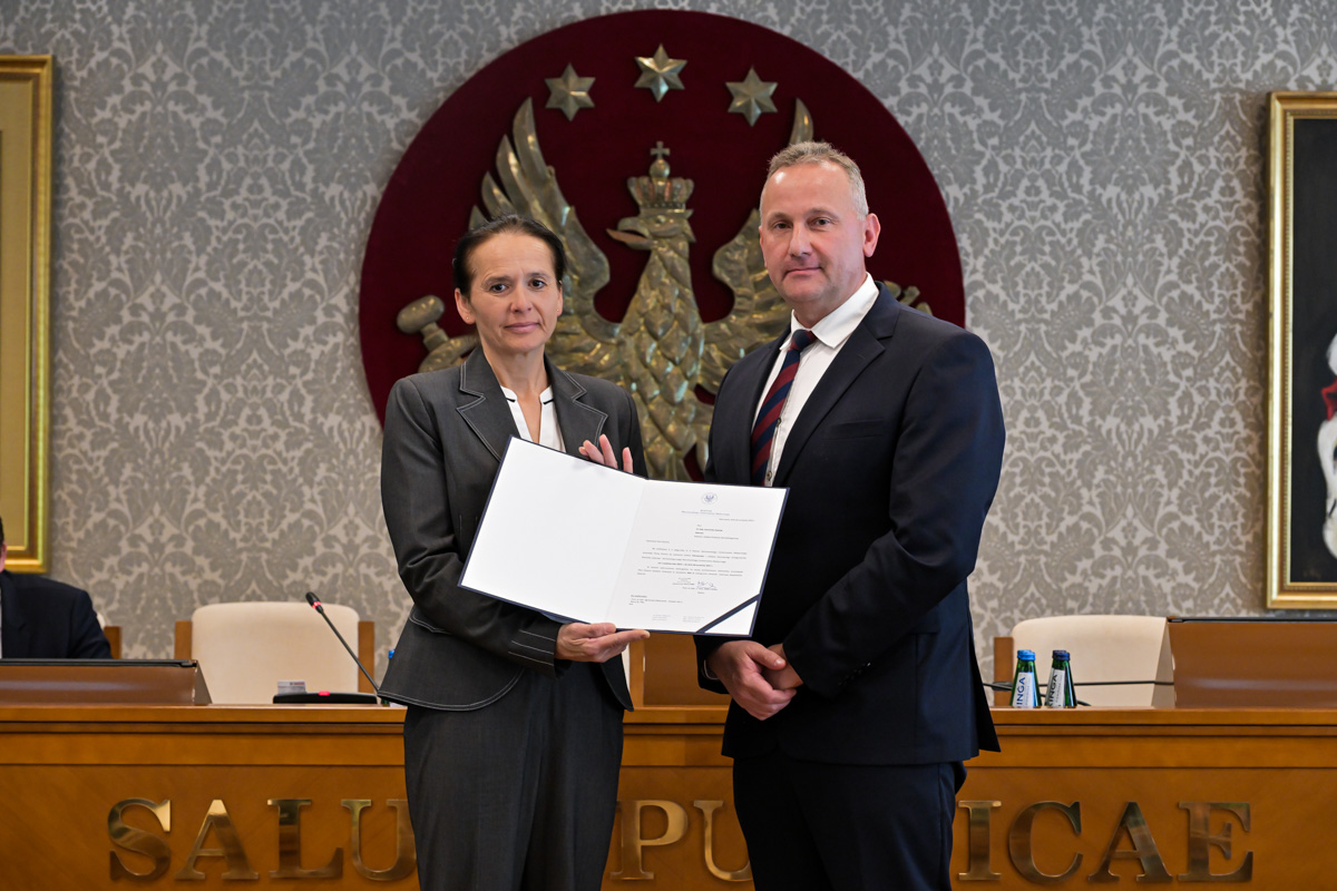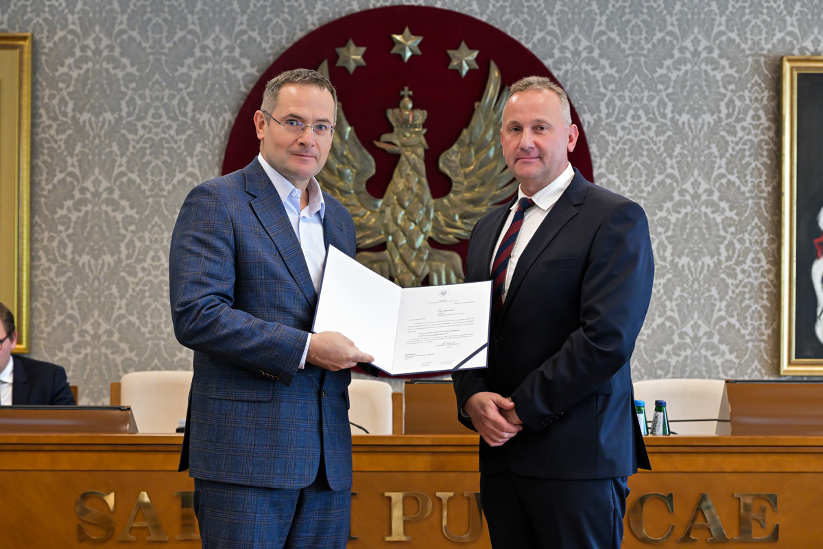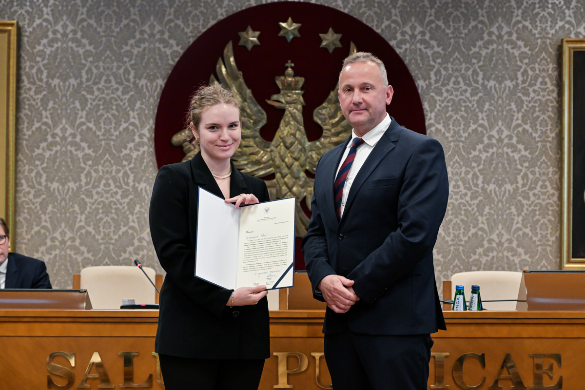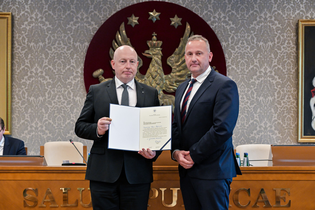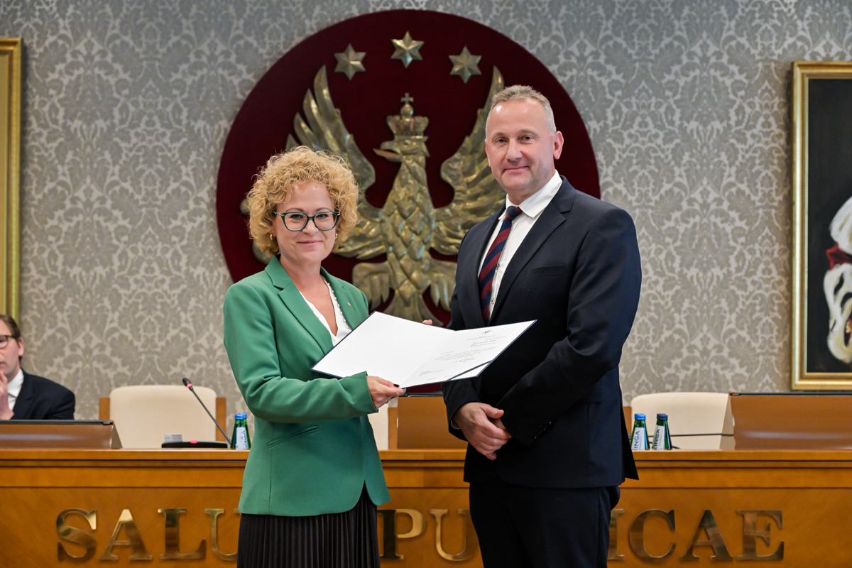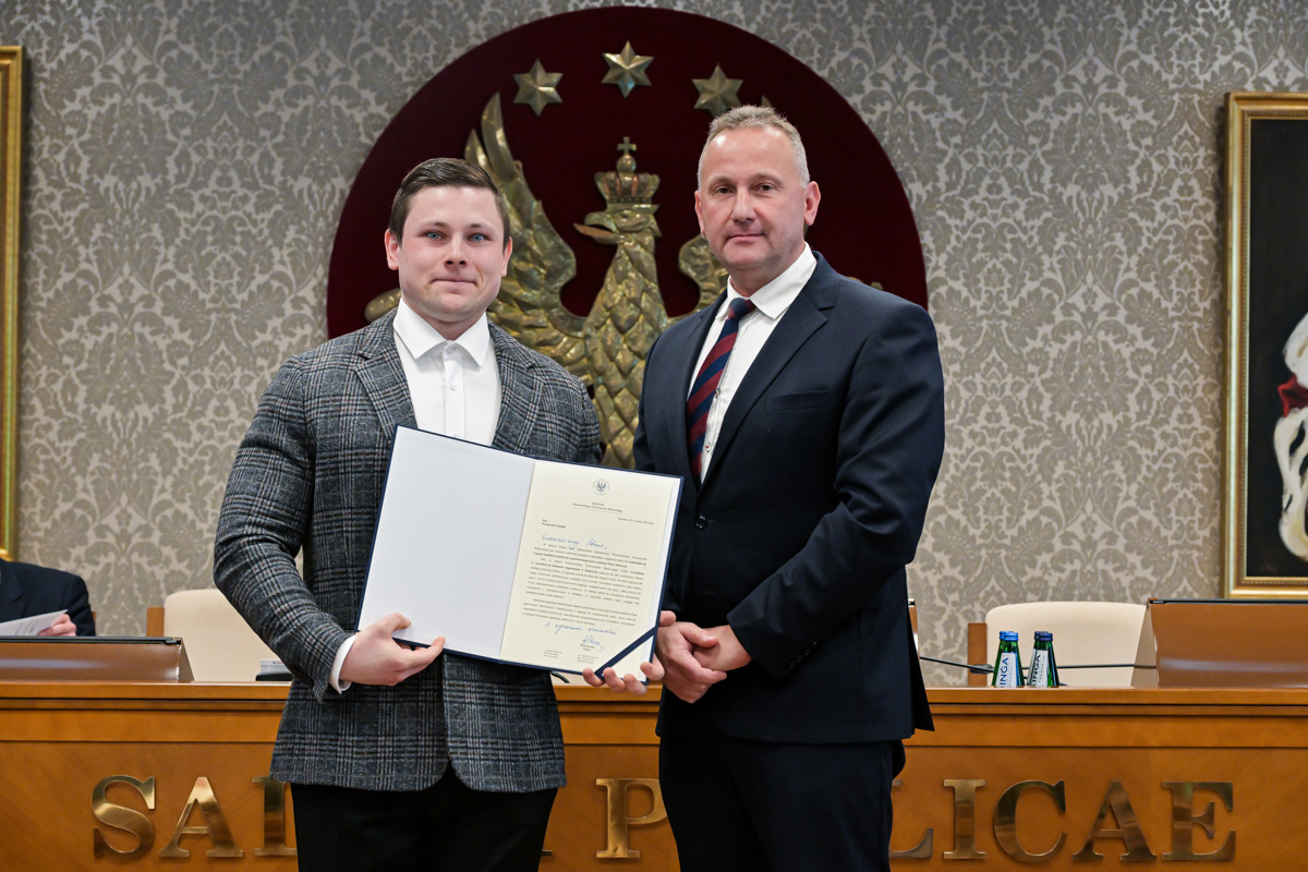 Galeria około 35 zdjęć z wręczenia dyplomów gratulacyjnych oraz powołań dla pracowników i studentów WUM. Na zdjęciach znajdują się pracownicy i studenci w towarzystwie prorektora ds. nauki i transferu technologii prof. Marcina Sobczaka. Osoby na zdjęciach otrzymują dyplomy w granatowych teczkach. Teczki są otwarte, widać w nich dyplomy. Większość osób uśmiecha się do zdjęcia. Wszystkie osoby na zdjęciach są formalnie ubrane: mężczyźni w marynarki lub garnitury, kobiety w sukienki lub marynarki i eleganckie koszule. Zdjęcia zostały wykonane w dużej sali - Sali Senatu WUM. Ściany sali pokrywa tapeta w odcieniu ciemnego złota z motywem roślinnym. Na ścianie wisi godło WUM: orzeł i gwiazdy na czerwonym tle, a także obrazy przedstawiające byłych rektorów WUM, ubranych w czerwone płaszcze z białymi futrzanymi kołnierzach i berłami rektorskimi w rękach. Obrazy są w złotych ramach.