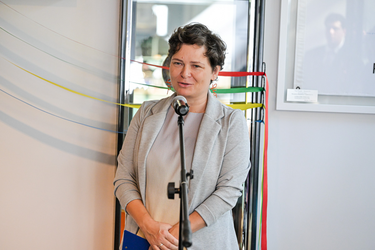 Wstęgę, a właściwie wstęgi w kolorach kół olimpijskich, z tablicy zdjęli: rektor prof. Rafał Krenke, prof. Marek Krawczyk oraz córki Andrzeja Kraśnickiego.