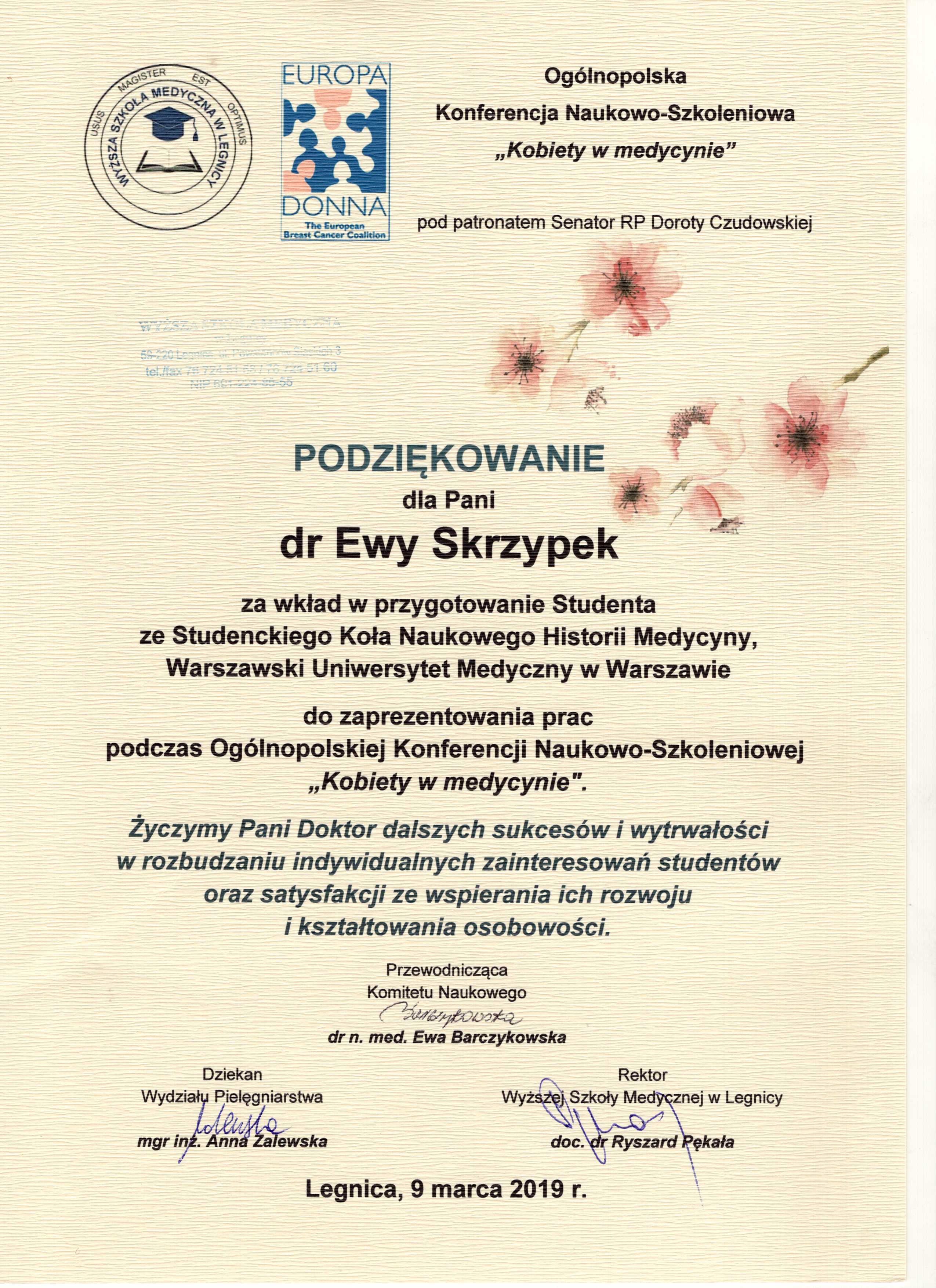 9 marca 2019 roku, w Wyższej Szkole Medycznej w Legnicy, odbyła się Ogólnopolska Konferencja Naukowo-Szkoleniowa zatytułowana „Kobiety w medycynie”. Komitet Naukowy Konferencji postanowił nagrodzić wyróżnieniami sześciu studentów, reprezentujących koła naukowe czterech uczelni w Polsce.