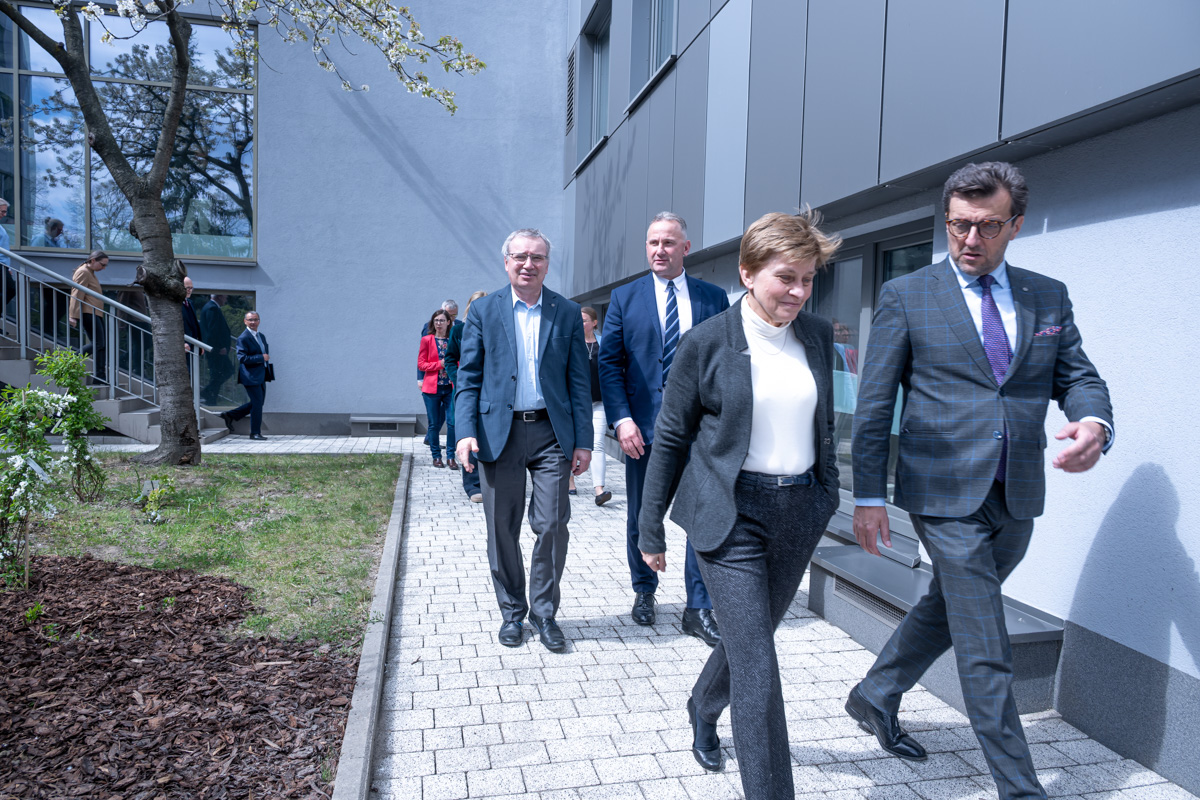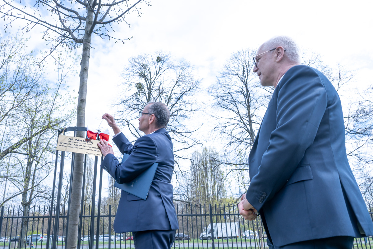 After the plaque was unveiled by Rector Rafał Krenke and Dean Piotr Luliński, the participants moved outside the faculty building. On the Żwirki and Wigury Street side of the building, a linden tree had previously been planted. A plaque placed beside it commemorates the anniversary of the Faculty of Pharmacy. As Prof. Piotr Luliński explained, the linden tree is an element of the Faculty of Pharmacy’s logo and also a symbol of femininity, family, and caregiving. It complements the oak (a symbol of masculinity), which appears in the logo of the Faculty of Medicine.