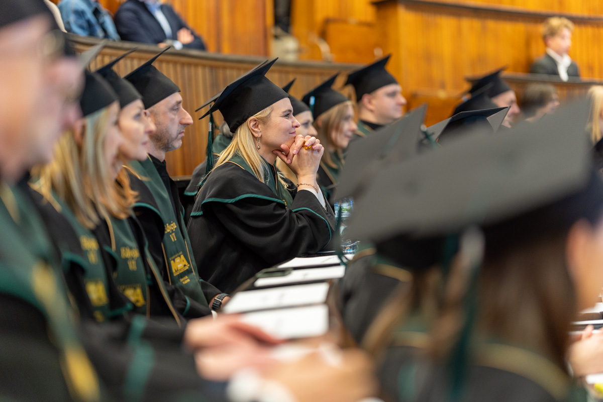 Graduates received their diplomas. Three Golden Birettas (for the highest grade point average) went to Jacek Sieńko, PhD Hab., Grzegorz Rychwalski J.D. EMBA, and Sylwia Jędrzejczyk-Kowalska. Certificates of recognition were awarded to the most valued lecturers: Rafał Mrówka, PhD Hab., Professor Monika Raulinajtys-Grzybek, Professor Piotr Wachowiak, and Tomasz Rostkowski, PhD Hab. Mariola Dwornikowska-Dąbrowska, PhD, MBA was recognized for organizing the study visit.