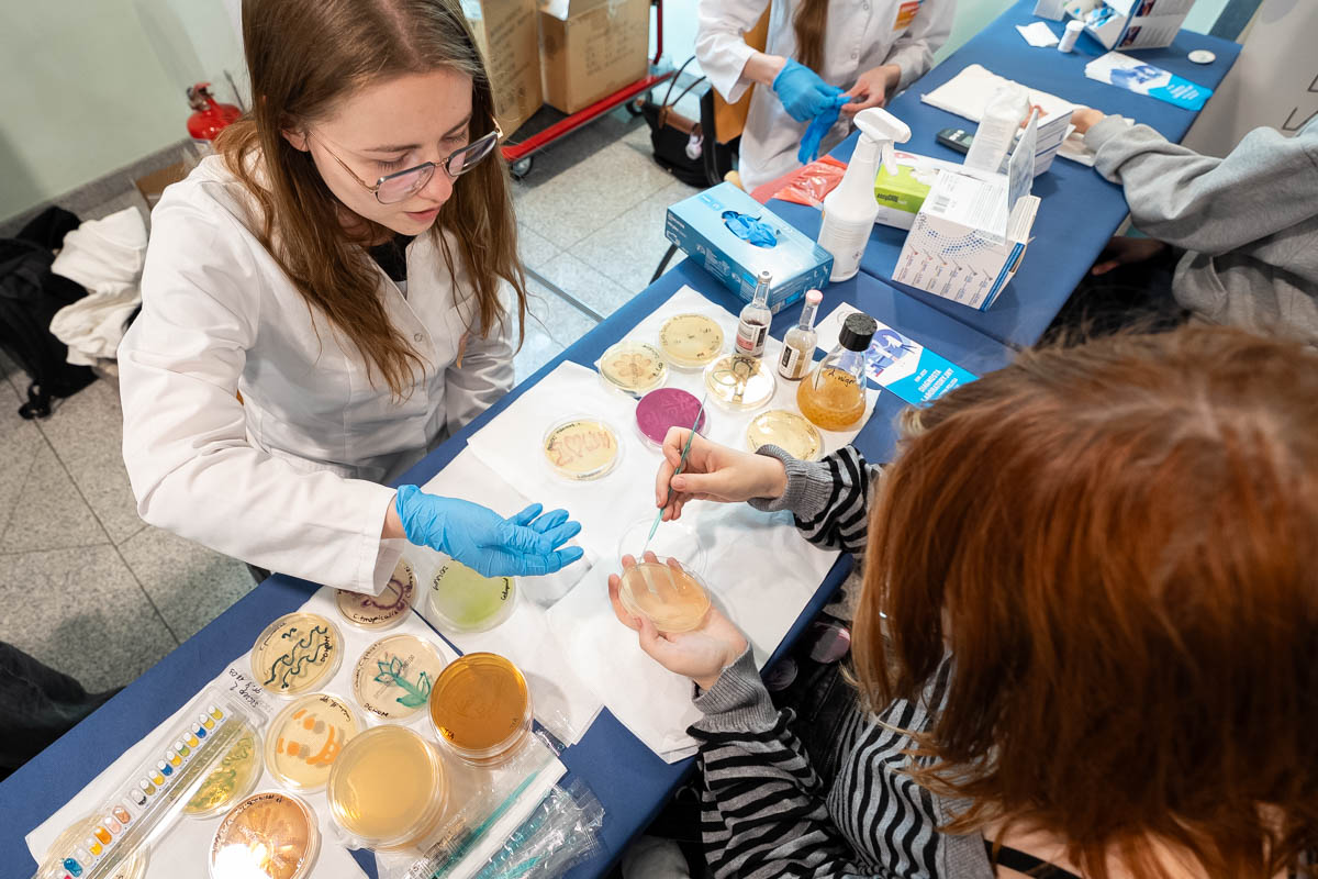 Many visitors also gathered at the stands, where queues frequently formed. For example, the Admissions stand was constantly visited by people curious about the requirements to be admitted to WUM. Stands representing individual fields, including those taught in English (ED and EDD), were also very popular. Students involved in scientific clubs prepared numerous attractions at their interactive stations, demonstrating medical curiosities. Visitors could practice emergency skills on manikins and simulators, examine anatomical models, measure glucose levels, or check their own metabolic age. An AI photo booth was another popular attraction.