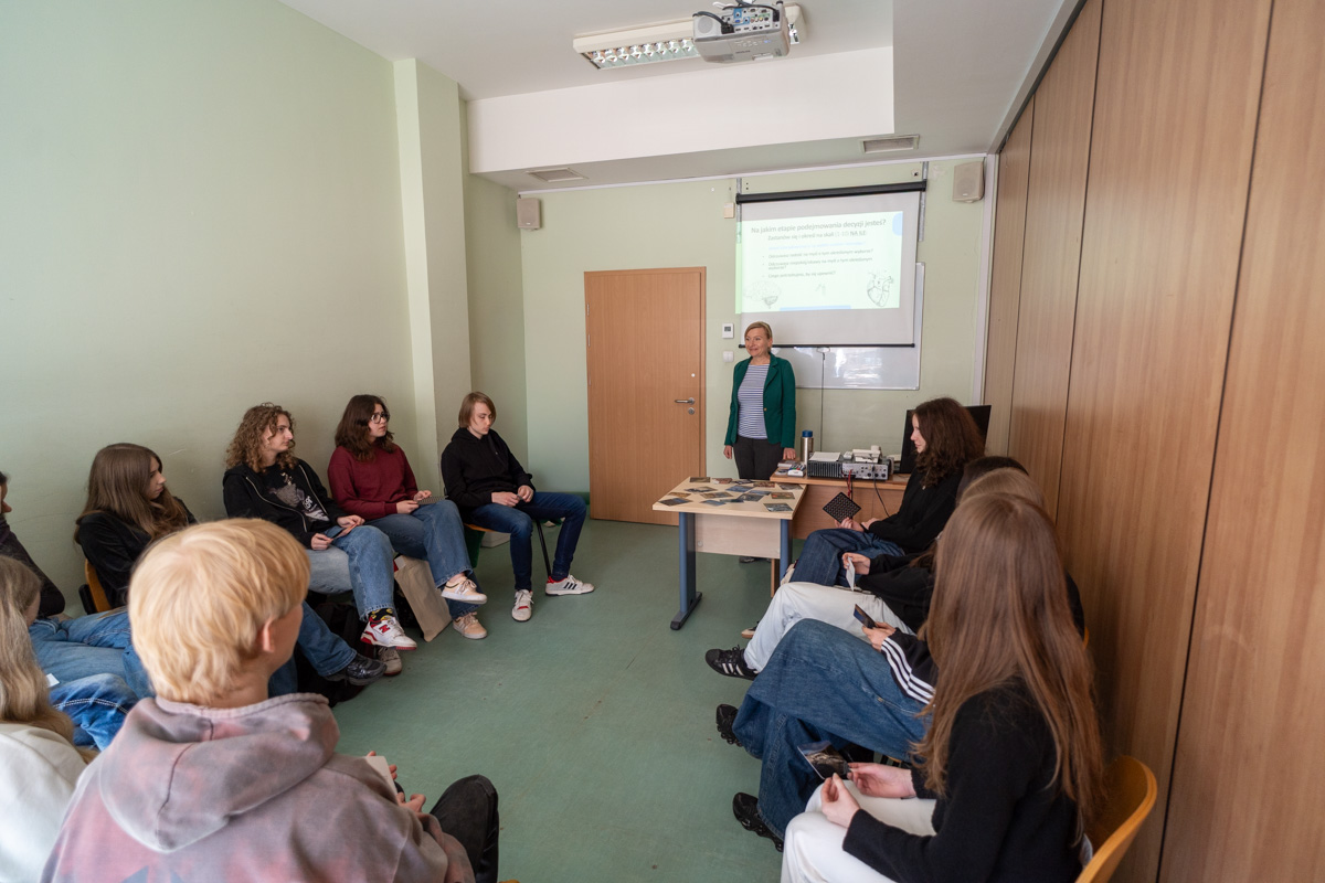The official speeches were followed by workshops and lectures. The lectures were held in the auditorium and were very diverse. Dr. hab. Longin Niemczyk answered questions related to admissions, while Antoni Ludew, a medical student, and Artur Koprucha, a dietetics student, encouraged students not to be afraid of anatomy and biochemistry. Dr. Tomasz Ciesielski from the Chair and Department of Experimental and Clinical Physiology, a winner of the Crystal Lancets, delivered a very interesting presentation. The lecturer shared tips on how to study effectively while making learning enjoyable, providing attendees with many valuable tips on how to memorize and understand material quickly. Tomasz Ciesielski also emphasized the importance of empathy in medical professions, noting that he learned a lot about it from his dog Tilda.