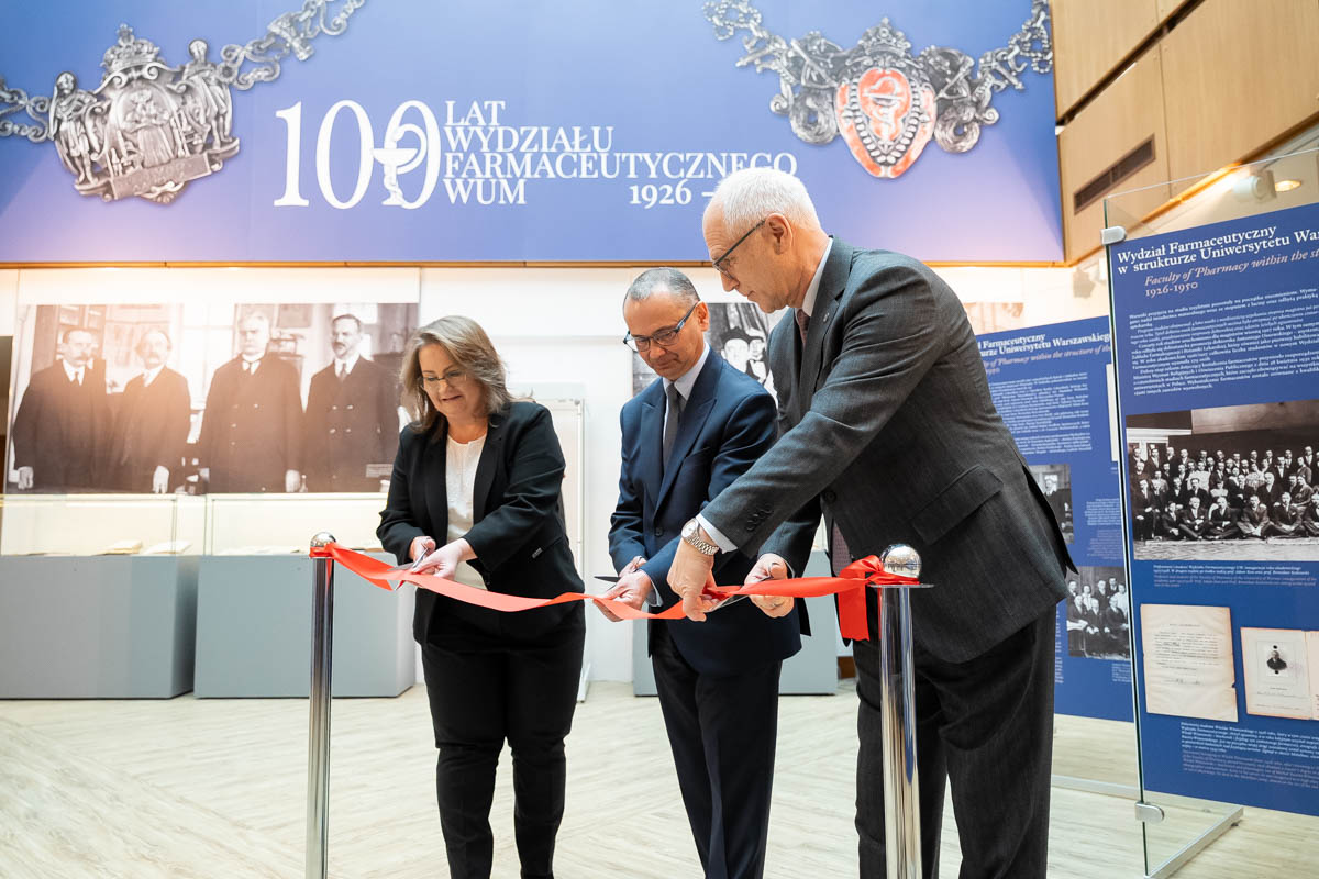 The host of the exhibition opening and the extraordinary meeting of the Faculty Council was Dr hab. Piotr Luliński, Dean of the Faculty of Pharmacy. The ceremonies were attended by: Professor Rafał Krenke, Rector of the Medical University of Warsaw; Professor Dorota Olczak-Kowalczyk, Vice-Rector for Human Resources and Operations; Professor Agnieszka Cudnoch-Jędrzejewska, Vice-Rector for Clinical Affairs and Investments; Professor Marcin Sobczak, Vice-Rector for Science and Technology Transfer; Professor Paweł Włodarski, Dean of the Faculty of Medicine; Dr hab. Piotr Regulski, Vice-Dean of the Faculty of Medicine and Dentistry; Dr hab. Łukasz Czyżewski, Vice-Dean of the Faculty of Health Sciences; Professor Renata Główczyńska, Professor Aleksandra Banaszkiewicz, and Professor Aneta Nitsch-Osuch, Vice-Deans of the Faculty of Medicine; Dr Marta Kijak-Bloch, Chancellor of the WUM; Wojciech Bogusz, Deputy Chancellor for Investments; Professor Marta Struga, Chair of the Medical Sciences Discipline Council; Professor Maciej Dawidowski, Vice-Chair of the Council for the Discipline of Pharmaceutical Sciences; Professor Alicja Wiercińska-Drapało, Member of the University Council; Professor Marek Krawczyk, Rector of WUM in the years 2008–2016; Professor Mirosław Wielgoś, Rector of WUM in the years 2016–2020; Professor Bożenna Gutkowska, Dean of the Faculty of Pharmacy in the years 1987–1993 and former Vice-Rector of WUM; Professor Jan Pachecka, Dean of the Faculty of Pharmacy in the years 1999–2002 and former Vice-Rector of WUM; Professor Joanna Kolmas, Dean of the Faculty of Pharmacy in the years 2020–2022; Professor Olga Ciepiela, Vice-Dean for Education in Medical Analytics; Dr hab. Agnieszka Bazylko, Vice-Dean for Pharmacy Education; Dr Monika Franczak-Rogowska from the Department of Medicinal Chemistry, Pharmaceutical and Biomedical Analysis; Dr Sławomir Białek, Coordinator for Postgraduate Education of the Faculty of Pharmacy at the Centre for Postgraduate Education of WUM; Professor Bogdan Ciszek, Head of the Department of Normal and Clinical Anatomy; Professor Ireneusz Sołtyszewski, Member of the Museum Council; Dr Monika Pintal-Ślimak, President of the National Council of Laboratory Diagnosticians; Marian Witkowski, Vice-President of the Supreme Pharmaceutical Chamber and President of the Regional Pharmaceutical Chamber in Warsaw; Mariusz Mańkowski, Member of the Management Board of Gedeon Richter Polska; Dr hab. Piotr Rudzki, Head of the Bioanalysis Laboratory at Celon Pharma S.A.; Dr Maciej Sosnowski, Director in the Clinical Research Department at AstraZeneca; Professor Iwona Arabas, Head of the Research Unit for the History of Natural and Medical Sciences at the Polish Academy of Sciences; Sabina Sobolewska, Chair of the Board of the Student Government of the Faculty of Pharmacy; and Grażyna Jermakowicz, Acting Director of the Museum of the History of Medicine at WUM, together with her team.
