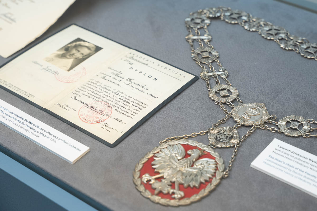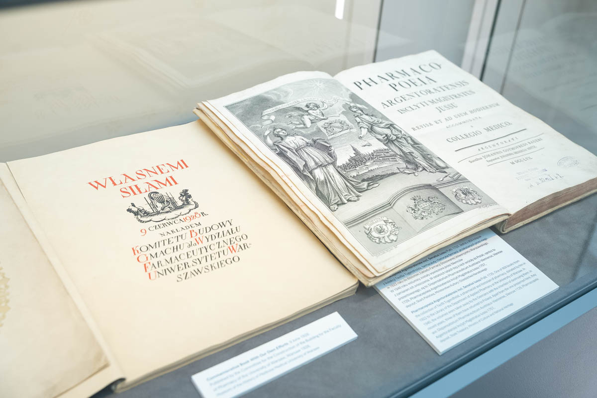 Among the most important exhibits are the original dean’s gown of Professor Władysław Mazurkiewicz, the first Dean of the Faculty of Pharmacy, and the dean’s chain of Professor Bronisław Koskowski, the Faculty’s second Dean. Visitors can also view a priceless volume by Teofil Tugendhold from the collection of the Department of Applied Pharmacy, which was recovered after it had been lost during the Second World War.