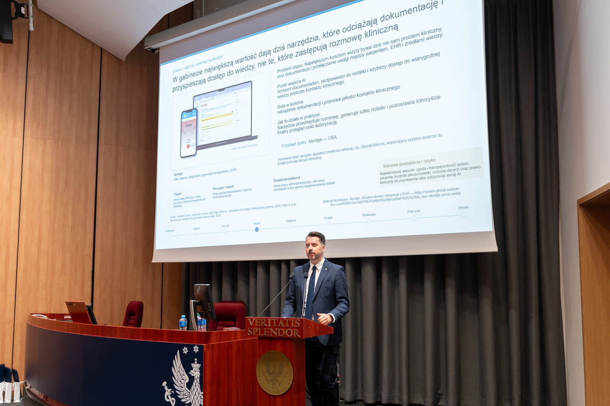 W drugiej części głos zabrał Janusz Szulik, prezes Tu Inter Polska, który opowiedział o ubezpieczeniu odpowiedzialności cywilnej lekarza dentysty na przykładach wybranych zdarzeń. Następnie wystąpił Artur Białoszewski z Zakładu Epidemiologii i Biostatystyki WUM z wykładem pt. „Sztuczna inteligencja w ścieżce pacjenta i procesie leczenia. Od decyzji zdrowotnej po długoterminową skuteczność terapii”.