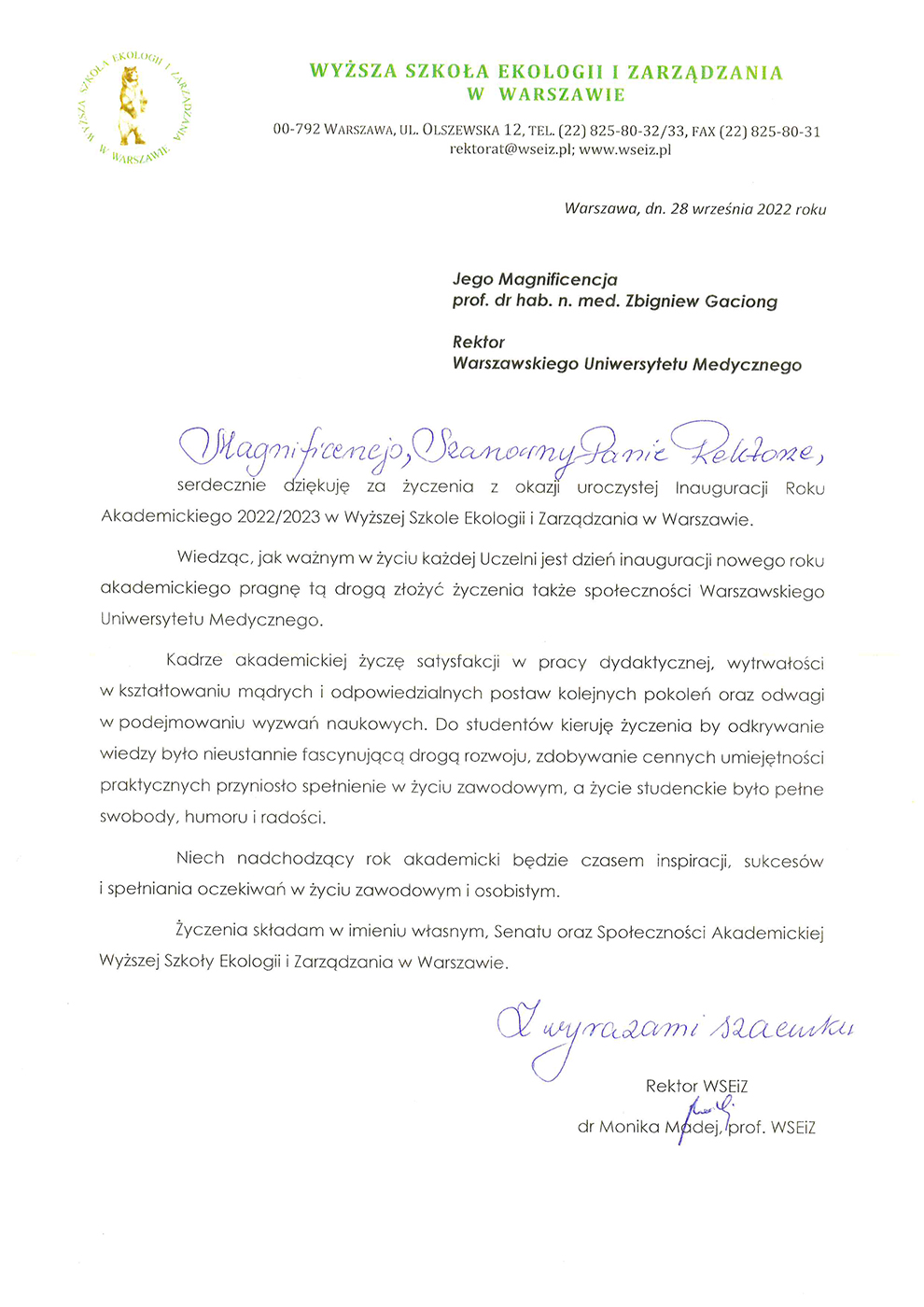 - List Rektor Wyższej Szkoły Ekologii i Zarządzania dr Moniki Madej